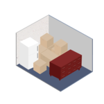 Storage unit with roll up door and concrete floor. It fits a dresser, a small mattress set, and several small to medium-sized boxes. This space is also perfect for garden tools, seasonal décor and sports equipment.