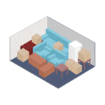 Storage unit with roll up door and concrete floor. It fits the contents of an entire family room or two full bedrooms, including several small to medium-sized boxes.